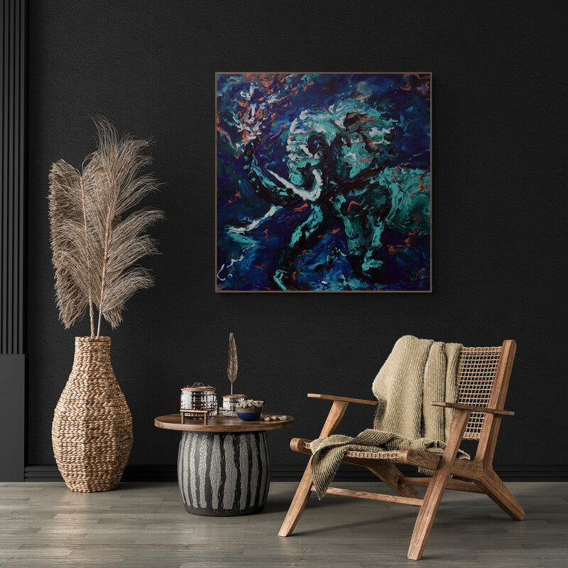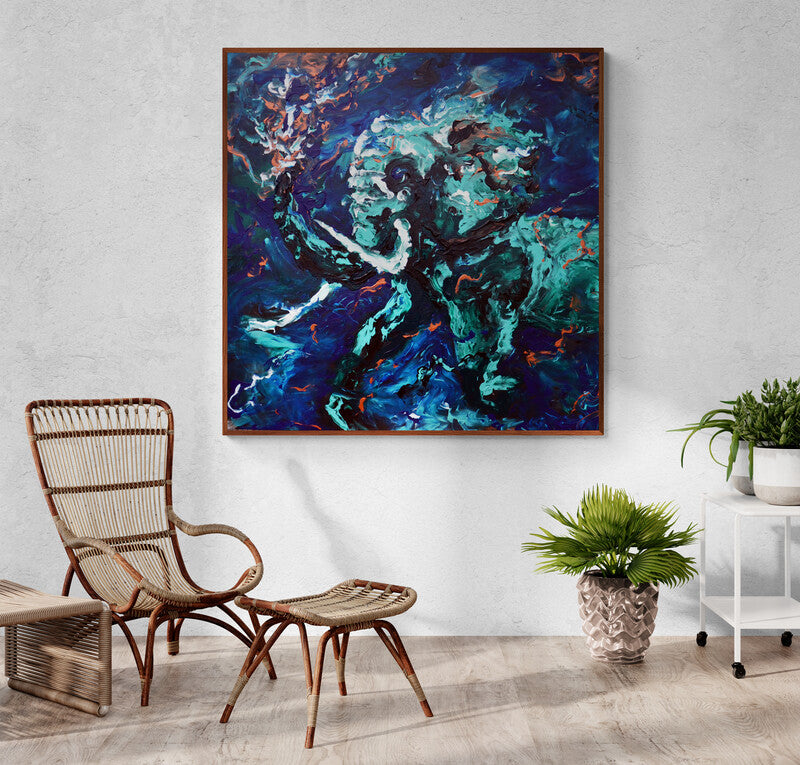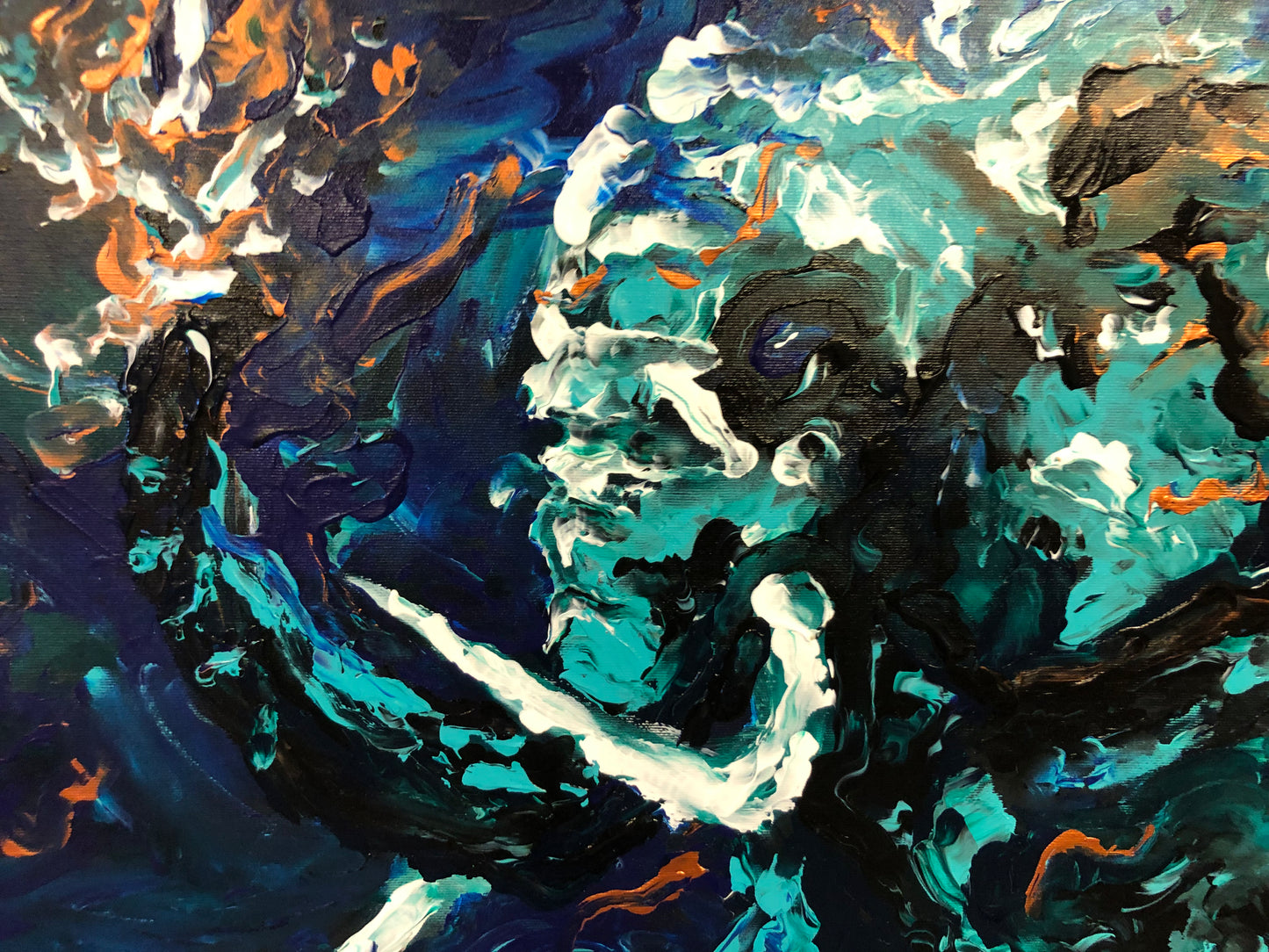 A abstract elephant swimming in water. It was painted in a moment when I stared to trust my intuition more. And did you know that elephants are such sensitive creatures?! They can sense things in the distance like no other animal. For example they seek higher rounds when a tsunami is about to strike. How they also stick together as a family, in all situations. They are such sensitive and wise creatures.
